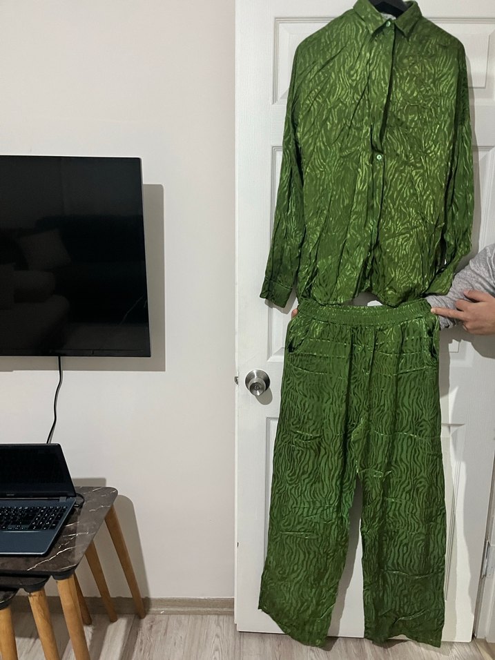 Koyu yeşil keten kumaştan, düğmeli, notched lapel yakalı ve uzun kollu, bol kesim midi uzunluğunda kadın takımı. Günlük kullanıma uygun, hafif dokulu kumaş.