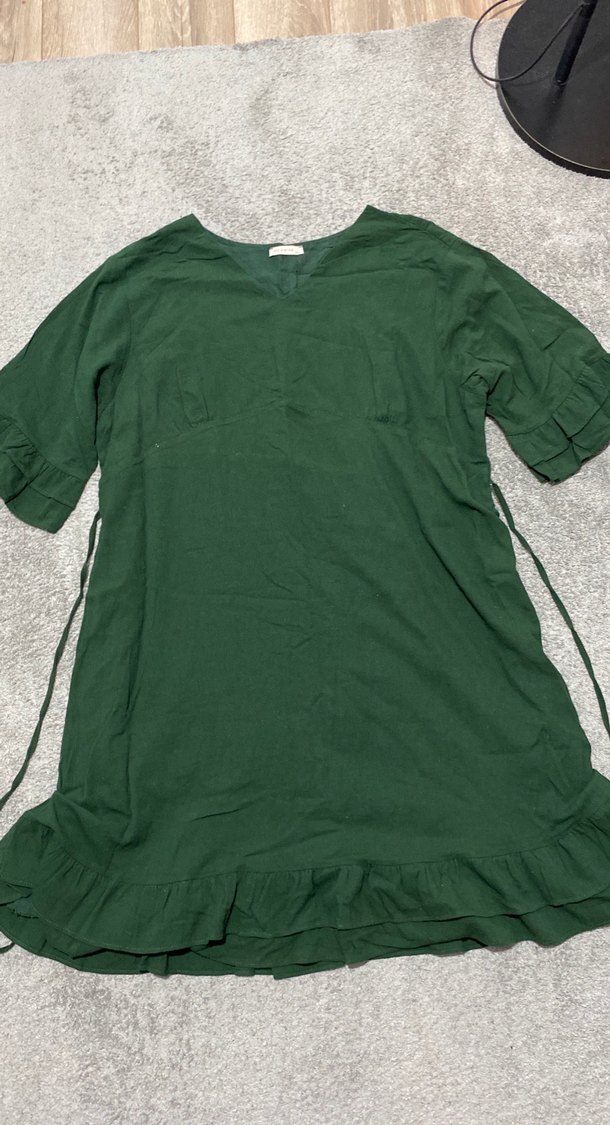 Koyu yeşil keten midi elbise, kısa kollu ve V yakalıdır. Bol kesimi ve volan detaylarıyla minimal, bohem stil sunar. Günlük şıklık için uygun. Astarlıdır