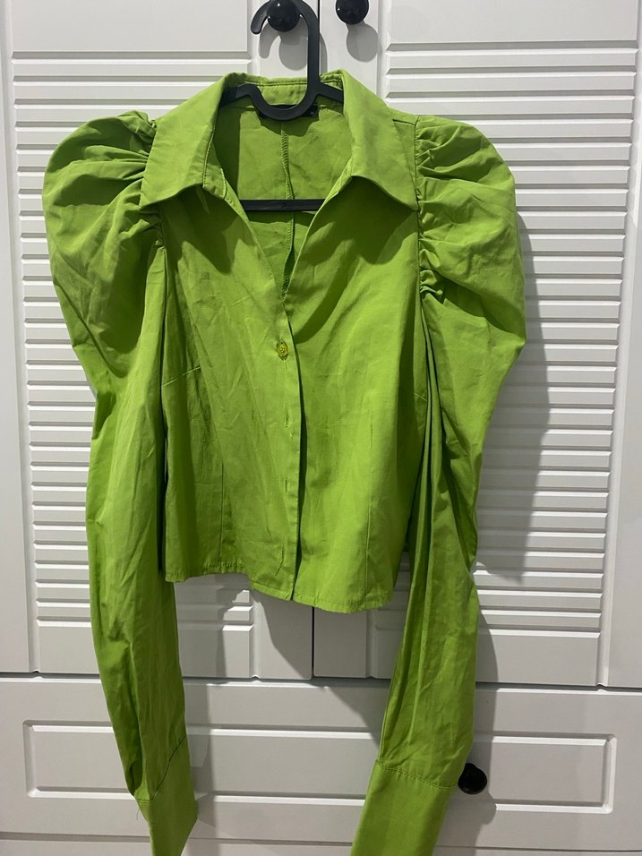 Parlak yeşil keten mini gömlek, uzun balon kollu, düğmeli ve yakalı tasarıma sahiptir, günlük sokak tarzı için uygundur.