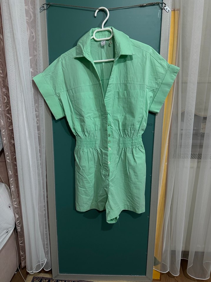 Yeşil keten kumaştan, kısa kollu, yakalı ve düğmeli, bol kesim kadın tulumudur. Günlük rahat sokak stili için uygundur.