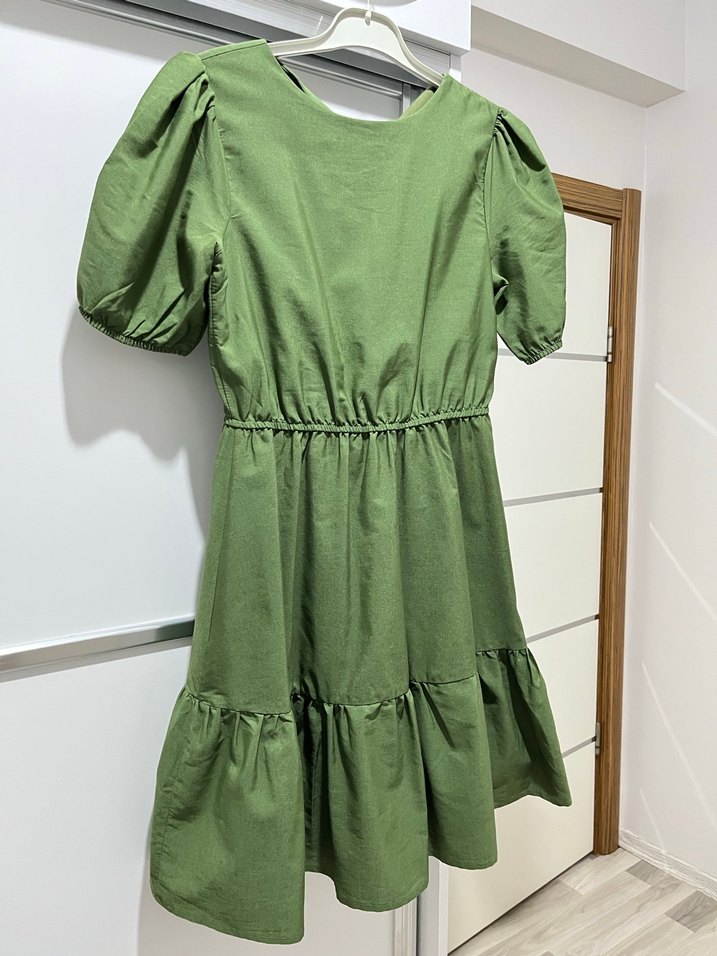 Yeşil Keten Mini Elbise, Fırfırlı