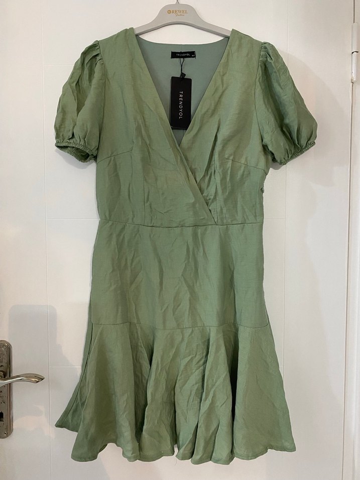 Yeşil keten mini elbise, V yaka ve kısa balon kollu. Bol kesim, günlük kullanım için uygun sokak stili. Hiç kullanmadım etiketli. Bedeni etiketinden daha dar bence