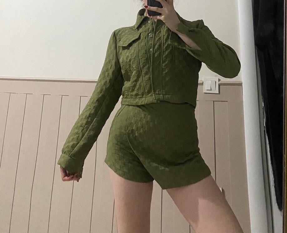 Koyu yeşil keten kumaştan, uzun kollu, yakalı ve düğmeli, dar kesim mini kadın takım.Rahat ve gündelik sokak stili için uygundur.