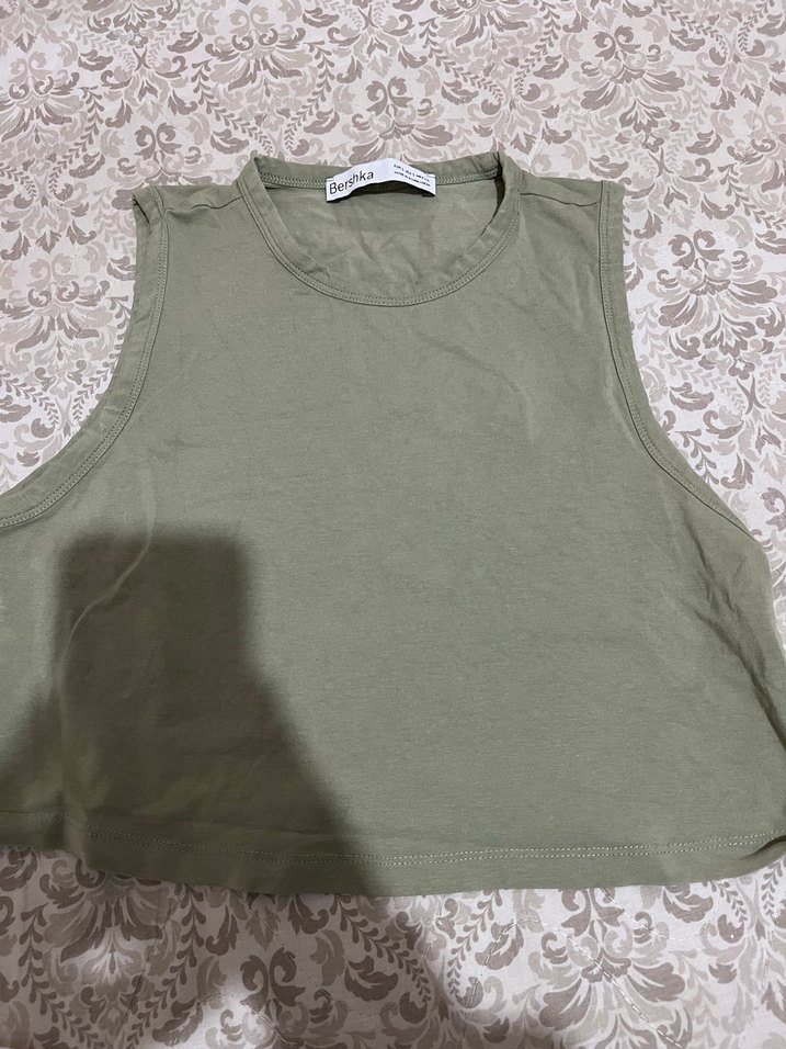 Yeşil keten kumaştan, kolsuz, yuvarlak yakalı, bol kesim mini atlet. Günlük kullanıma uygun, rahat sokak stili.