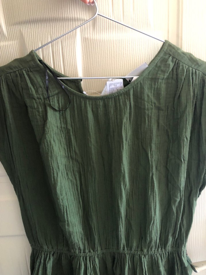 Yeşil keten elbise , pilili detaylı ve kolsuzdur. Salaş kesimi ve midi boyu ile günlük kullanım için uygundur. Bohem tarzda şık bir seçim.