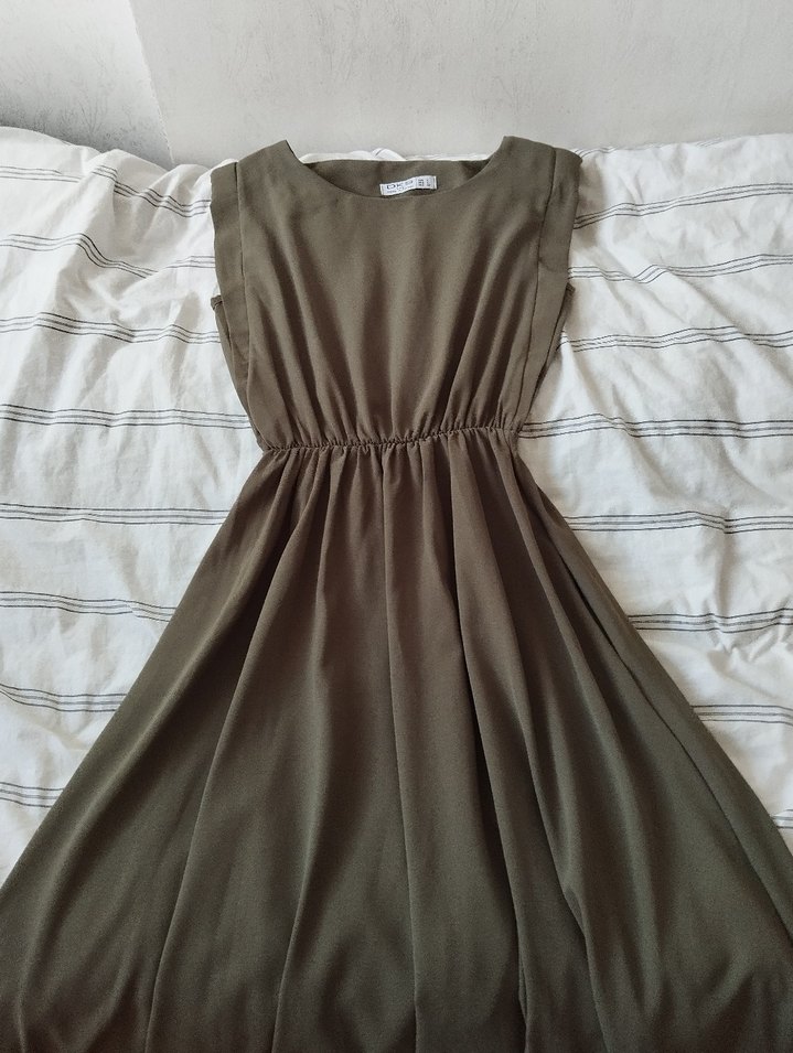 TESETTÜRE GİRMEK İSTEDİĞİM İÇİN KARALADIM AMA BÖYLE GÖRÜNÜYOR RENGİ DE ORADAKİ GİBİYeşil keten uzun elbise, tek renk ve salaş kesimlidir. Kayık yaka ve kolsuz tasarımıyla minimal ve bohem tarzı yansıtır.