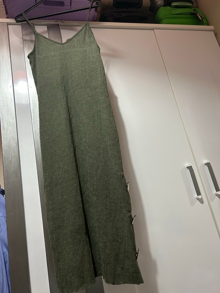 Uzun yeşil bürümcük kumaş, askılı ve yakası kesik detaylıdır. Rahat kesimi ve sol yan altta 3 adet sedef düğme ile kapalı yırtmaç detaylı günlük sokak stiline uygundur. Temiz kullanılmış tiril tiril elbise