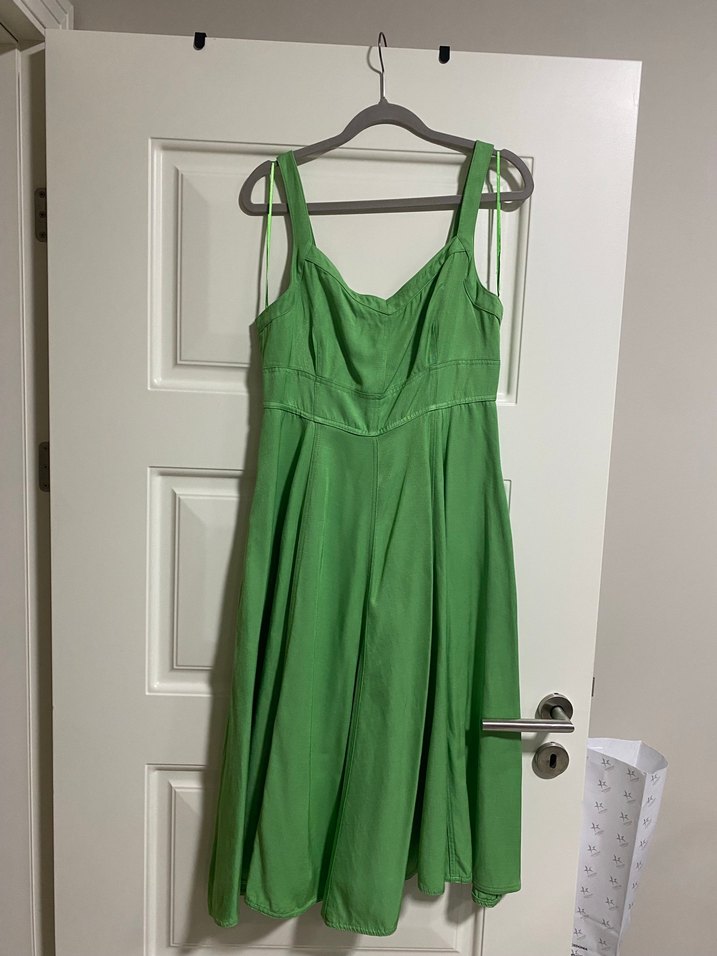 Yeşil keten uzun elbise, drapeli detaylar ve geniş askılarla bol kesim sunar. Parlak ve desensiz tasarımı günlük kullanıma uygundur.
