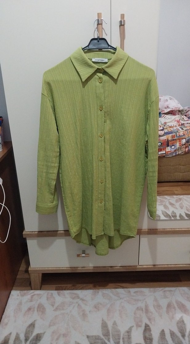 Yeşil keten, düğmeli, uzun kollu, salaş kesim gömlek. Bohem tarz ve pastel tonlarla günlük rahat kullanım için uygundur.