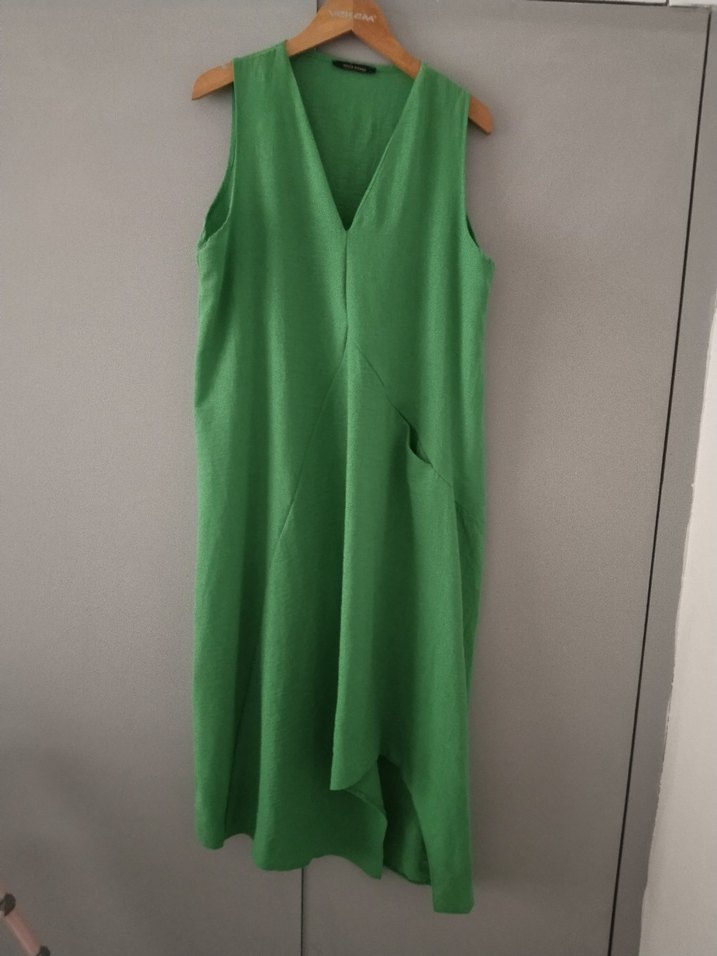 Parlak yeşil keten kumaştan, V yakalı ve drapeli, salaş kesim uzun elbise, günlük kullanım için uygundur.