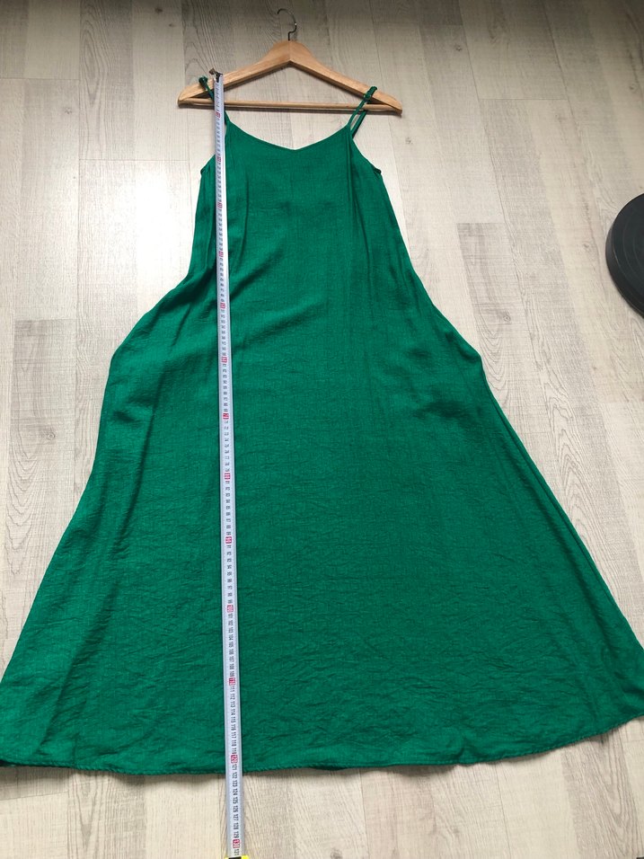 Yeşil keten uzun elbise, V yaka ve kolsuz. Salaş kesimi ve drapeli stili ile bohem tarzda, açık hava için uygun.Mağazamızın çekimlerinde kullanılmış ve yıkanıp bu platformda uygun fiyata satışa sunulmuştur.