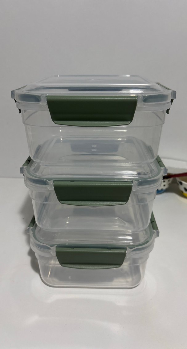 Yeşil kilit mekanizmalı, şeffaf plastikten yapılmış üçlü saklama kabı seti. Üst üste konabilir ve hava geçirmez özellikte.