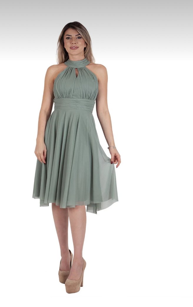Yeşil renkte , kısa ve fitted kesime sahip abiye elbise, yüksek yakalı ve drapeli detaylı, ince askılı tasarımıyla düğünlere uygun.