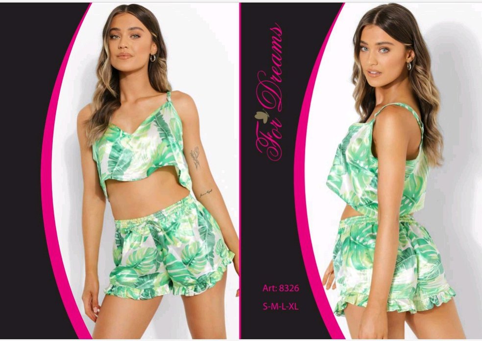 Yeşil tonlarında bağlama desenli, kısa ve bol kesim kadın pijama takımı, S-XL beden aralığında.