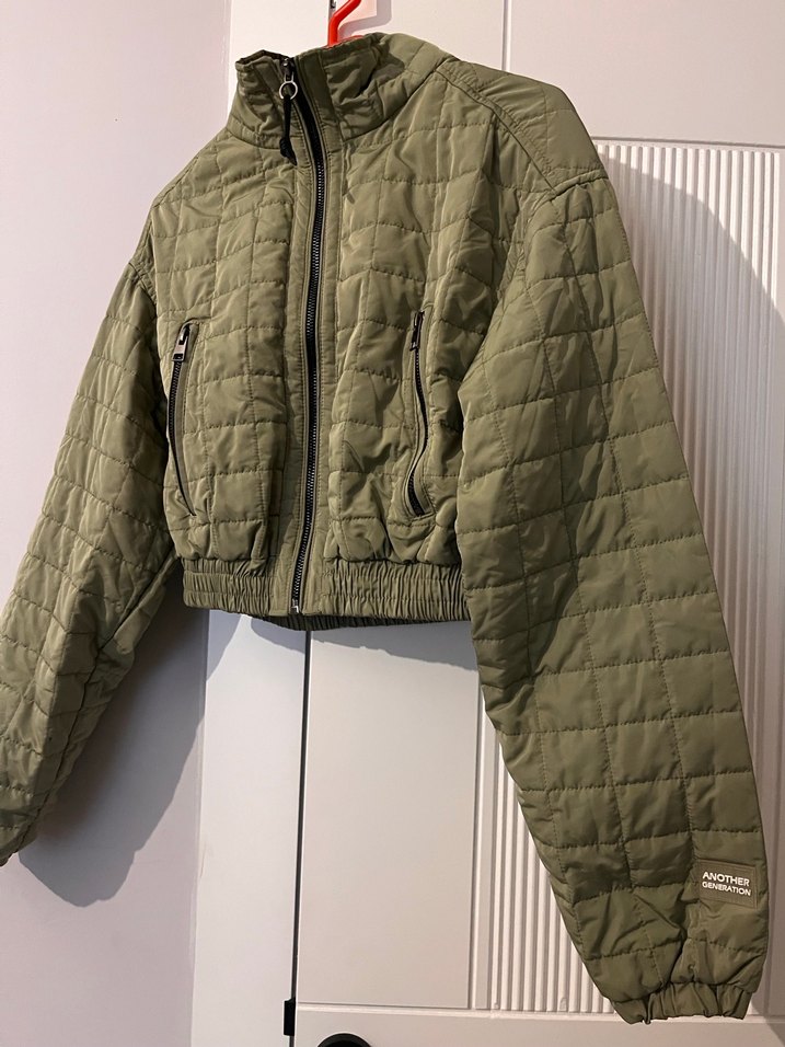 Yüksek yakalı, uzun kollu, fit kesim kısa mont. Yumuşak, kapitone kumaştan, fermuarlı cepler ve ön fermuar içerir. Sokak stiline uygun.Ürün bedeni olmadığından dolayı 1 defa giyilmiştir.