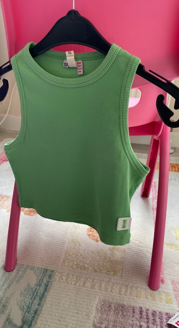 Pamuk gibi yumuşak sentetik kumaştan yapılmış, yeşil renkli, kısa kesim ve kolsuz, yuvarlak yakalı dar kesim atlet. Spor ve günlük şıklık için uygun, desen içermeyen tasarım.
