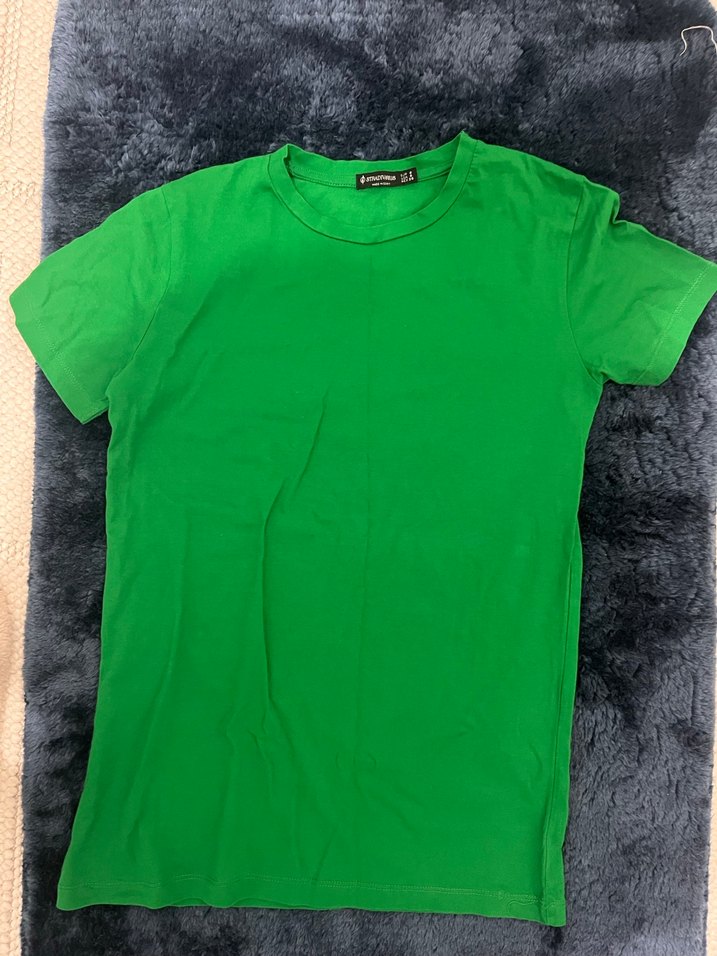 Yeşil renkli, kısa kollu, bisiklet yaka ve vücuda oturan kesime sahip, yumuşak ve sıcak kumaştan üretilmiş basic tişört.