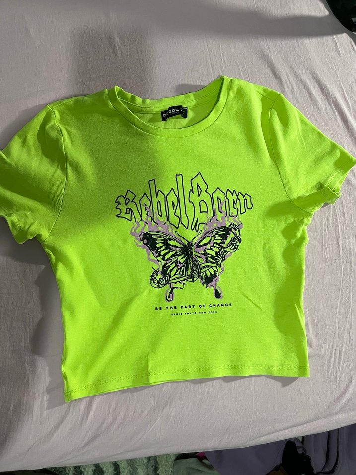 Yeşil renkli, baskılı kelebek ve yazı detaylı, kısa kollu, kısa kesim, dar kesim kadın tişörtü. Sentetik kumaştan üretilmiştir.