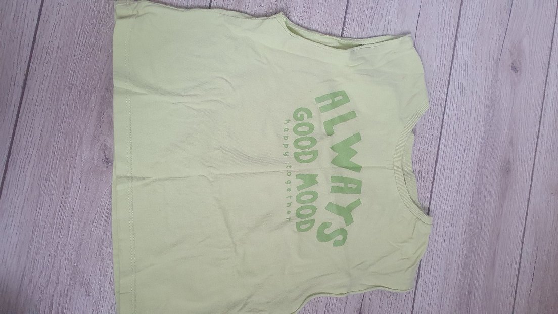 Pamuklu yumuşak kumaştan, yeşil renkli, kısa kollu ve baskılı "ALWAYS GOOD MOOD" yazılı, salaş kesim çocuk tişörtü.