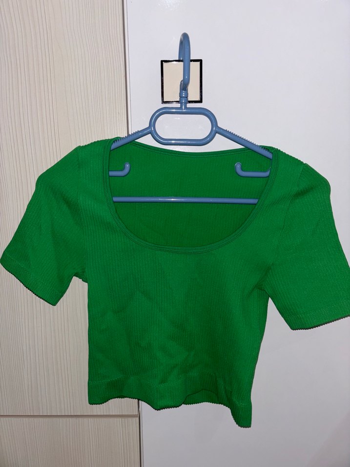 Yuvarlak yaka, kısa kollu, yeşil crop top.