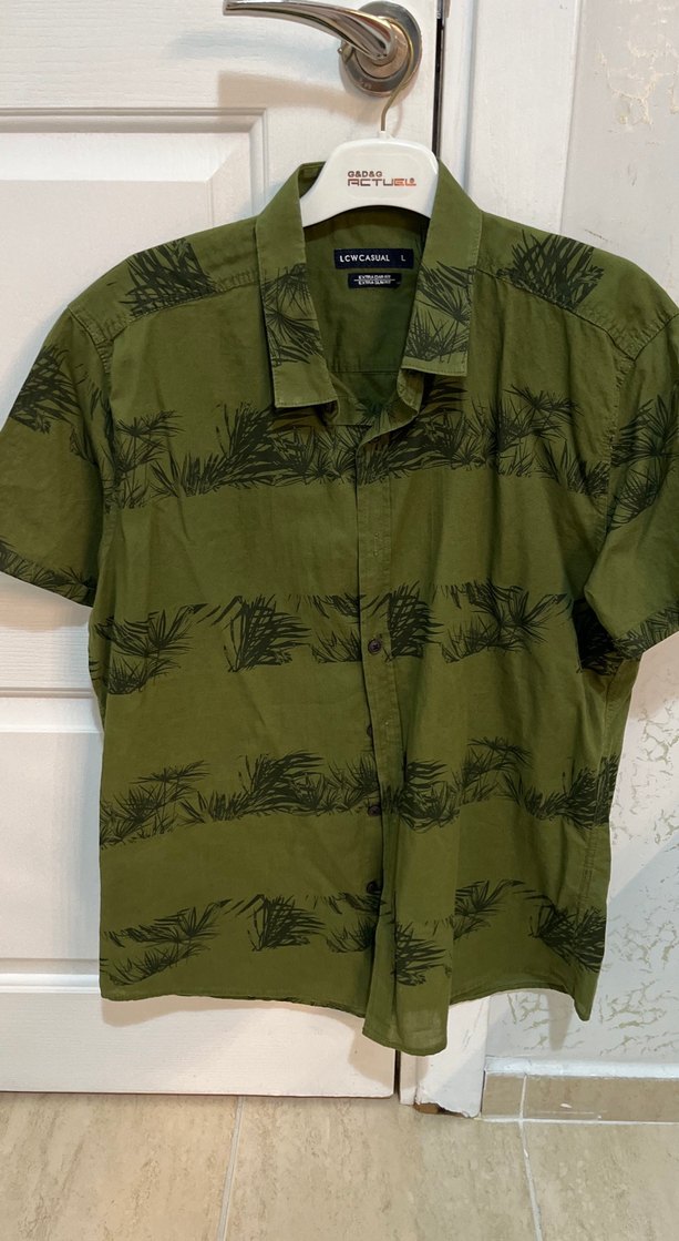 Keten kumaştan, yeşil renkli, kısa kollu, yakalı ve düğmeli erkek gömleği. Salaş kesim ve hafif desenli, günlük rahat stil için uygun.