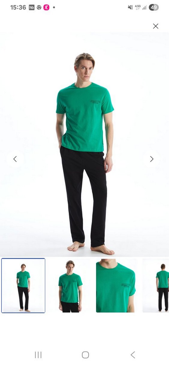 Erkek pijama takımı, koyu yeşil kısa kollu, bisiklet yaka ve regular fit üst ile siyah midi boy pantolondan oluşur. Rahat ve normcore tarzda, zahmetsiz şıklık sunar.