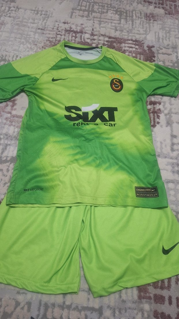 11,12 yaş Erkekler için sentetik kumaştan, kısa kollu, yuvarlak yakalı, bol kesim yeşil spor forma takımı. Baskılı desen ve örme detaylar, SIXT ve Nike logolu. ⚽