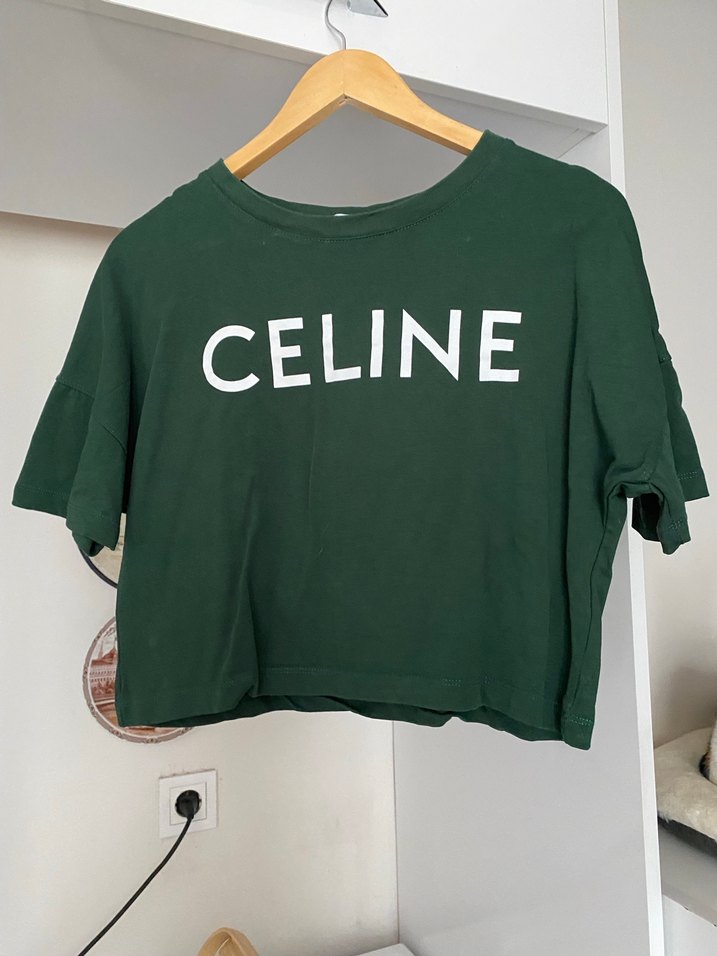 Yeşil renkli, pamuklu, kısa kollu, fırfırlı ve bol kesim kadın tişörtü. Üzerinde CELINE baskısı bulunur, günlük şık sokak stili için uygundur.