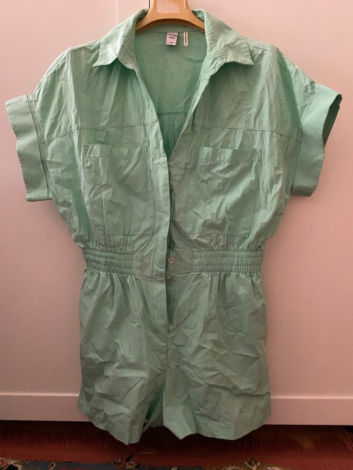 Kadın tulumu, yakalı ve kısa kollu tasarıma sahiptir. Düğmeli ön kısmı ve elastik bel detayı ile rahat bir kesime sahiptir. Pastel yeşil renkte, keten kumaştan üretilmiştir ve günlük kullanım için uygundur.
