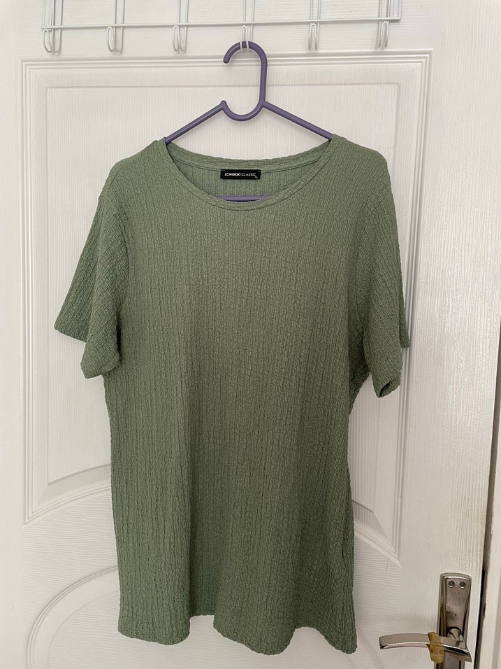 Kısa kollu, yuvarlak yakalı yeşil tişört, salaş kesim ve dokulu kumaşla gündelik, minimalist tarz sunar.
