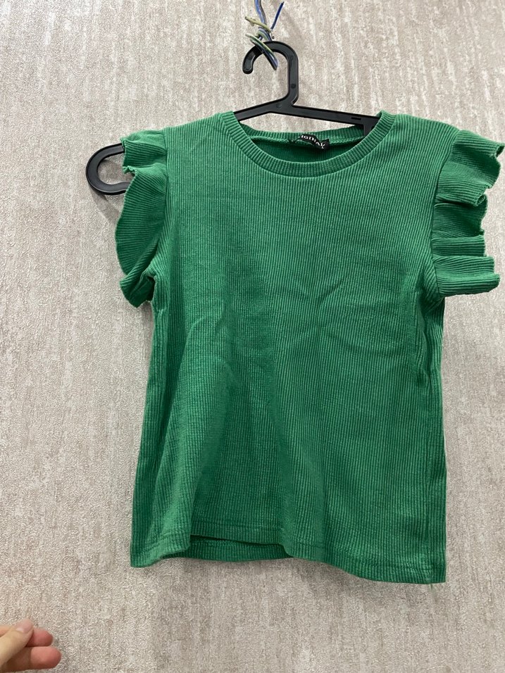 Kısa kollu, fırfırlı detaylı, yuvarlak yakalı yeşil kız çocuk tişörtü, rahat keten kumaştan üretilmiştir.