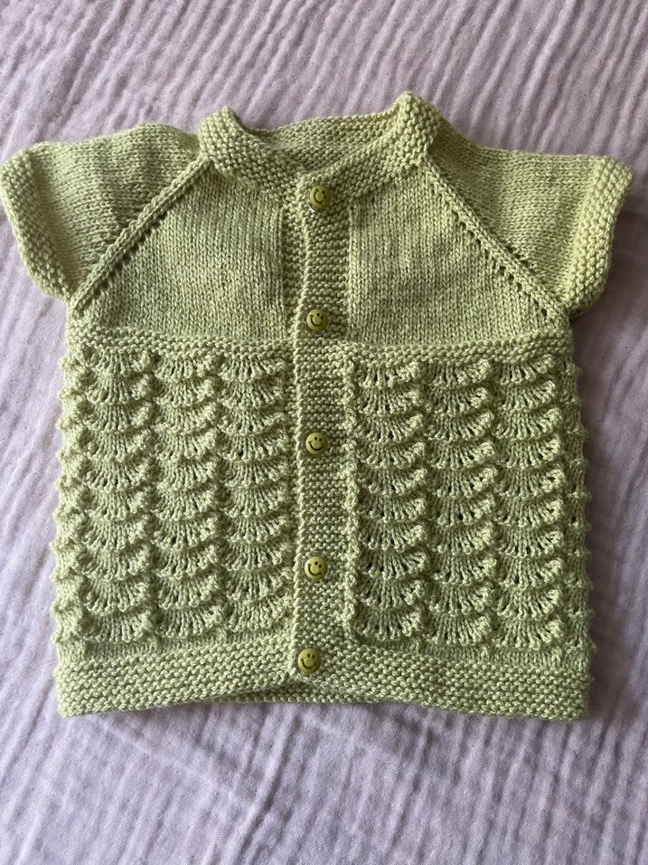Fitted yeşil triko hırka, bisiklet yaka ve kısa kollu. Alt kısmında dokulu örgü deseni ve düğmeli ön kapama bulunur. Günlük kullanıma uygun. El ÖRGÜSĞ