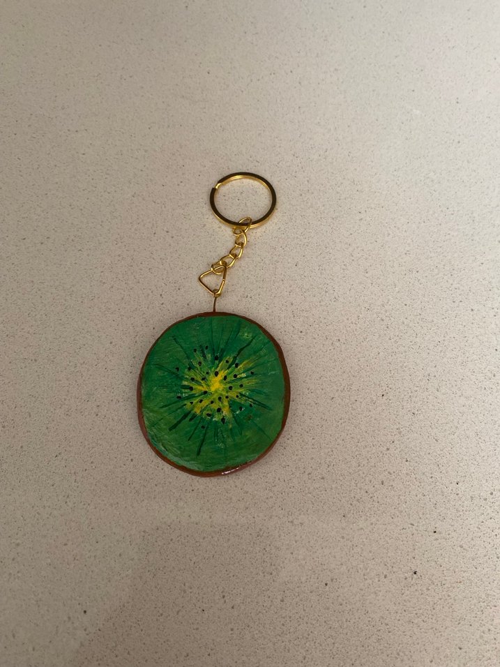 El yapımı kil hamurundan kivi deseni ve renkli püskülü ile minimalist, bohem tarzda anahtarlık.