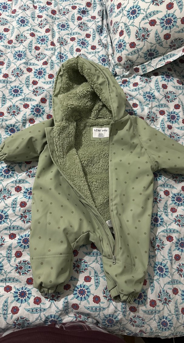 Yeşil renkli erkek bebek tulumu, yumuşak polar astar ve kolay kullanım için fermuarlı ön kısma sahip 1-2 kez giydirildi hiçbir kusuru yok.
