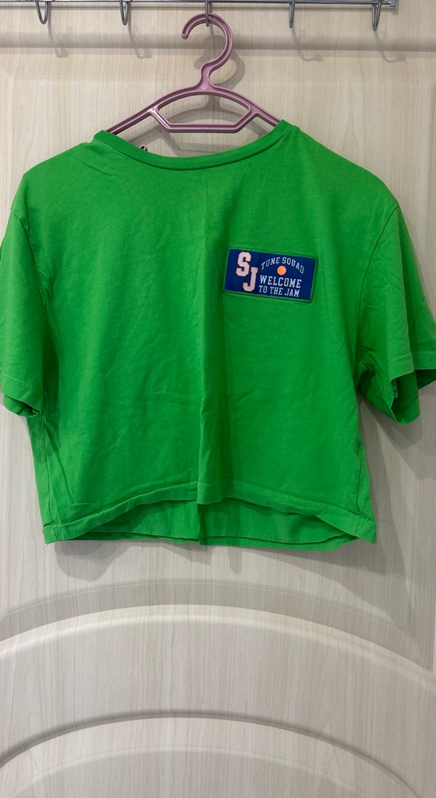 Yeşil renkli, kısa kollu, yuvarlak yaka ve bol kesim kız çocuk tişörtü. Renkli baskılı patch ve düğme detaylarıyla sokak modasına uygun.