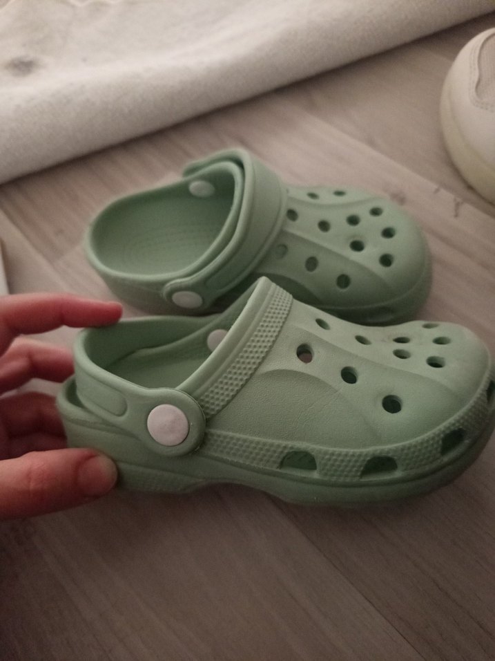 Düğmeli bantları ve havalandırma delikleri olan açık yeşil kauçuk kız terlikleri, sade ve kullanışlı tasarım sunar.