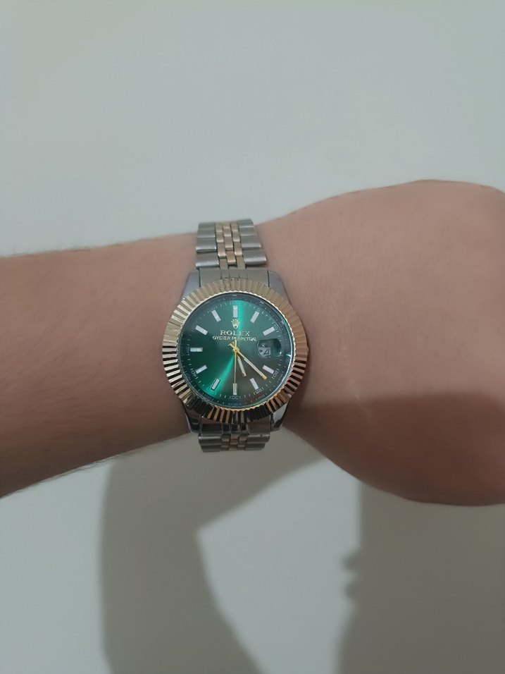 Parlak yeşil kadranlı, klasik tasarımlı ve iki renkli metal kayışlı erkek saati. Sokak stiline uygun şık bir model. ⌚