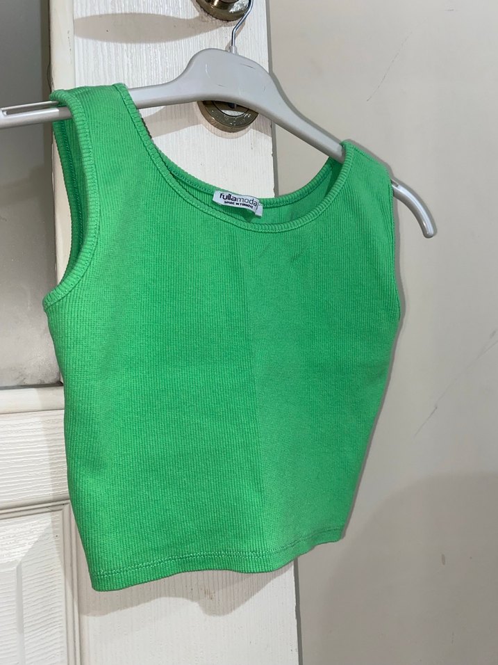 Kolsuz ve yuvarlak yakalı, parlak yeşil renkli, keten kumaştan yapılmış kadın atlet. Normal midi boyunda, sade ve desen içermeyen basic tasarım, günlük kullanım için uygundur.