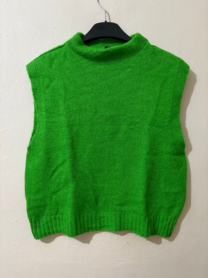 Yeşil renkli, kolsuz ve boğazlı bu triko süveter, kısa boyda ve bol kesimdir. Örgü kumaştan yapılmıştır, rahat ve günlük kullanıma uygundur.