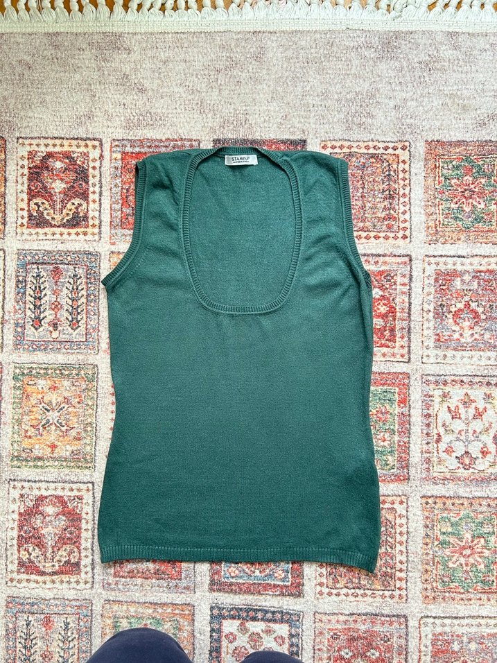 Koyu yeşil, kolsuz ve fitted kesim bohem tarzda, crew neck detaylı, düz dokuma kumaştan yapılmış bir atlet.