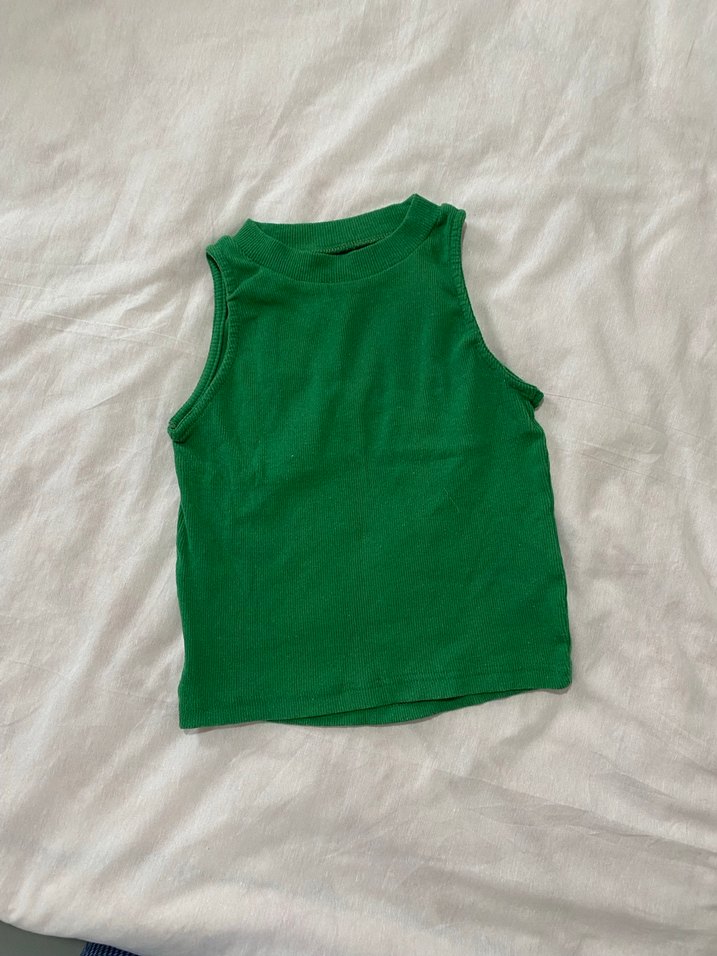 koyu yeşil, kolsuz ve desensiz, yumuşak dokulu bir crop