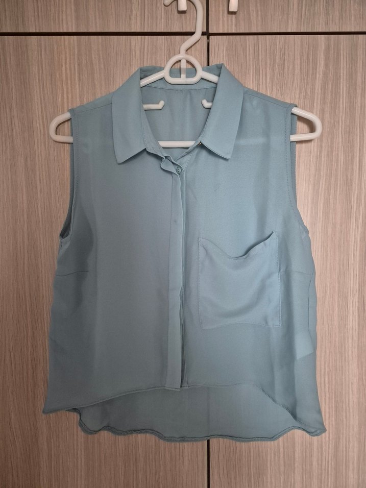 Yeşil, kolsuz, yakalı ve düğmeli, cep detaylı kadın gömlek. Rahat kesimli ve yumuşak sentetik kumaştan üretilmiştir. Günlük sokak stili için uygundur. Novabutikadan alınmıştır. 36-38 beden uyumludur.