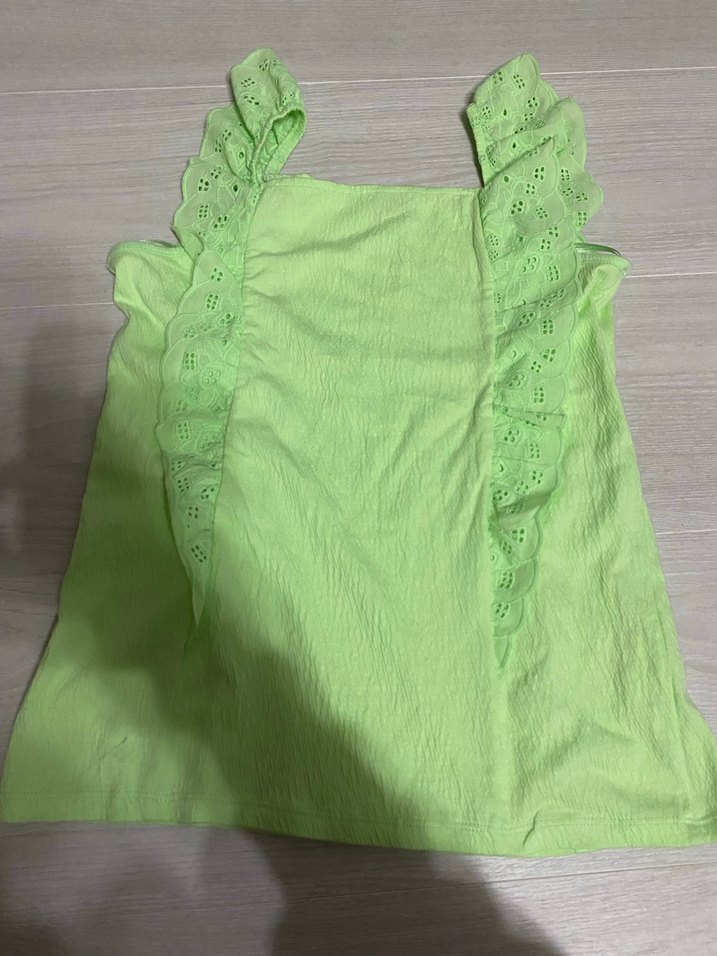 Kolsuz yeşil bluz, fırfır detaylı ve straplez kesimlidir. Mini boyda, pastel renkte, günlük rahat kullanıma uygundur. 12-13 yaş için uygundur.