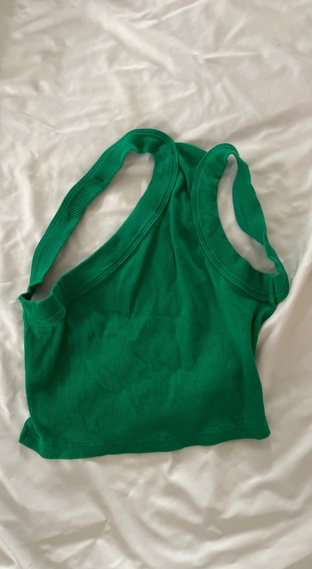 Yüksek yakalı, kolsuz, keten kumaştan yapılmış yeşil crop top. Günlük kullanım için sade ve minimalist tasarım. En sonda arkasının nasıl gözüktüğünü attım