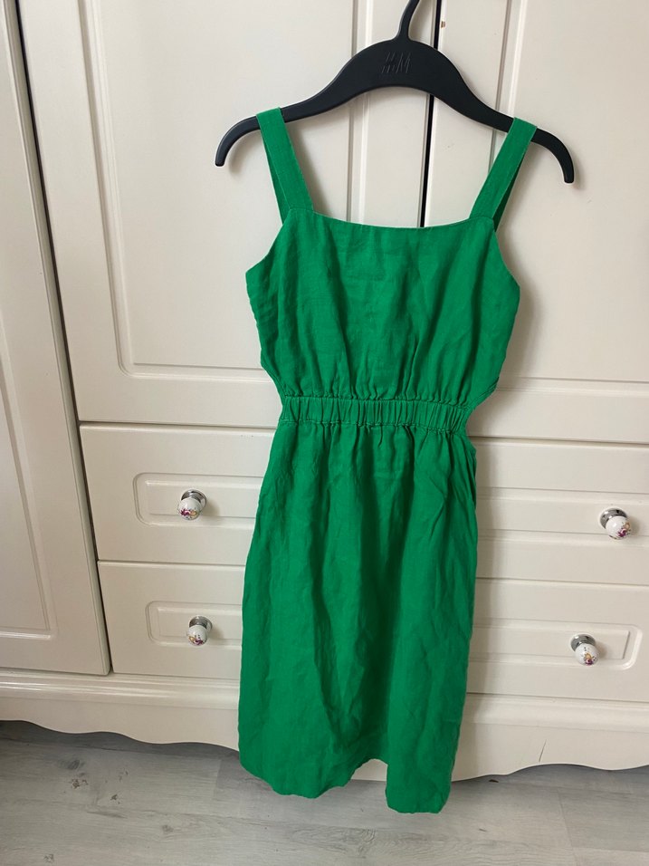 Yeşil, kolsuz midi elbise, straplez yaka ve drapeli detaylara sahip. Yumuşak keten kumaştan, günlük sokak stiline uygun.