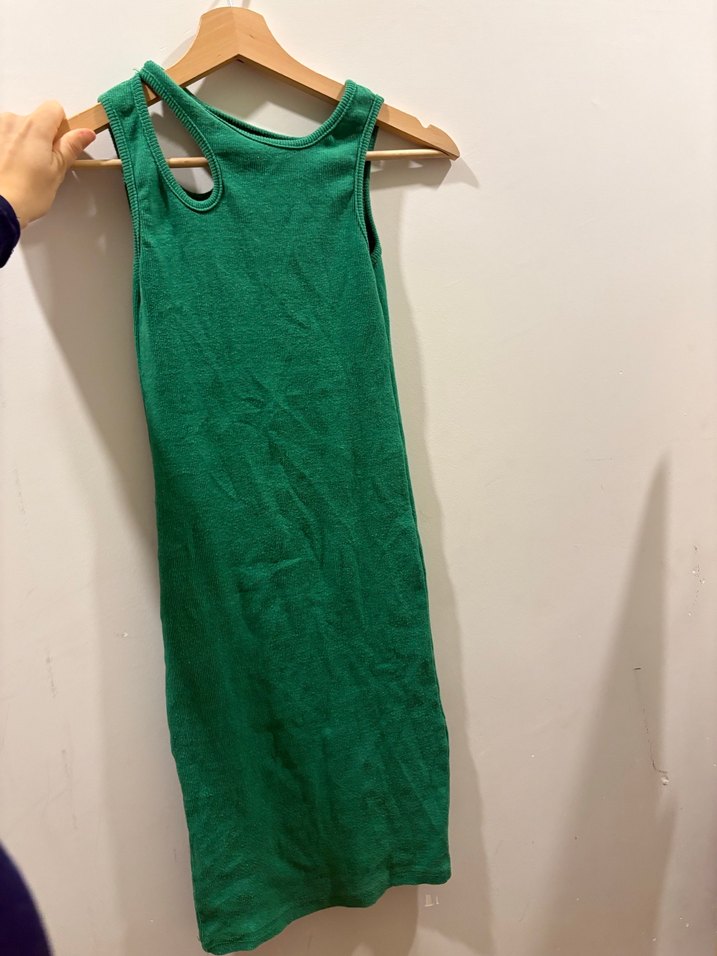 Fitted kesim, kolsuz yeşil keten elbise, yüksek yakalı ve yırtmaçlı, minimalist sokak modasına uygun günlük kullanıma uygun.