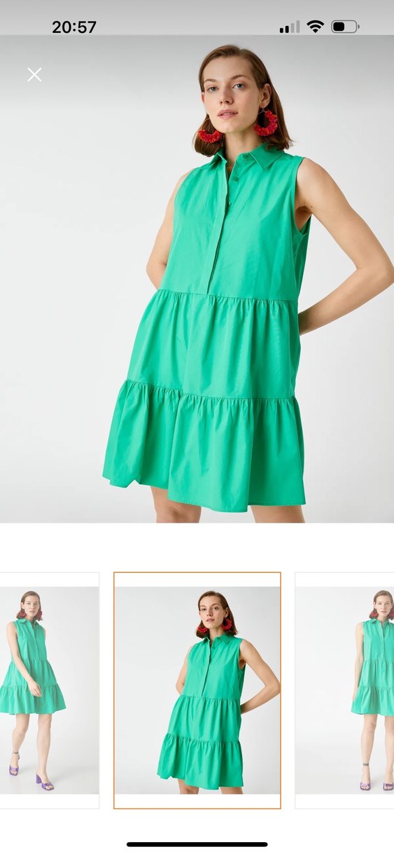 Yeşil, kolsuz, yüksek yakalı mini elbise, fırfır detaylı ve bol kesim. Sentetik kumaştan modern bir tasarım.