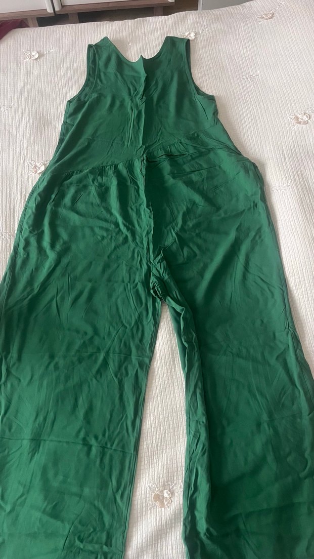 Yeşil kolsuz tulum, bol kesim ve V yakaya sahiptir. Yumuşak keten kumaştan yapılmış, drapeli tasarıma ve midi boyda, dış mekan kullanımı için uygundur, sirt detayli ve fermuarli tulum. Ölçüleri: omuzdan boy uzunluğu 135cm, iki koltuk arası 45 cm, omuzdan ağı 80 cm. Kullanılmamış sifir urun. Tertemiz.