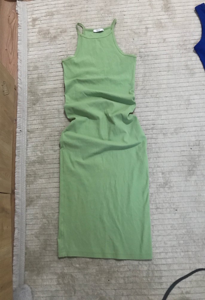 Yüksek yakalı, kolsuz, pastel yeşil renkli keten kumaştan, uzun ve vücuda oturan minimalist elbise. Günlük kullanım için rahat ve şık.
