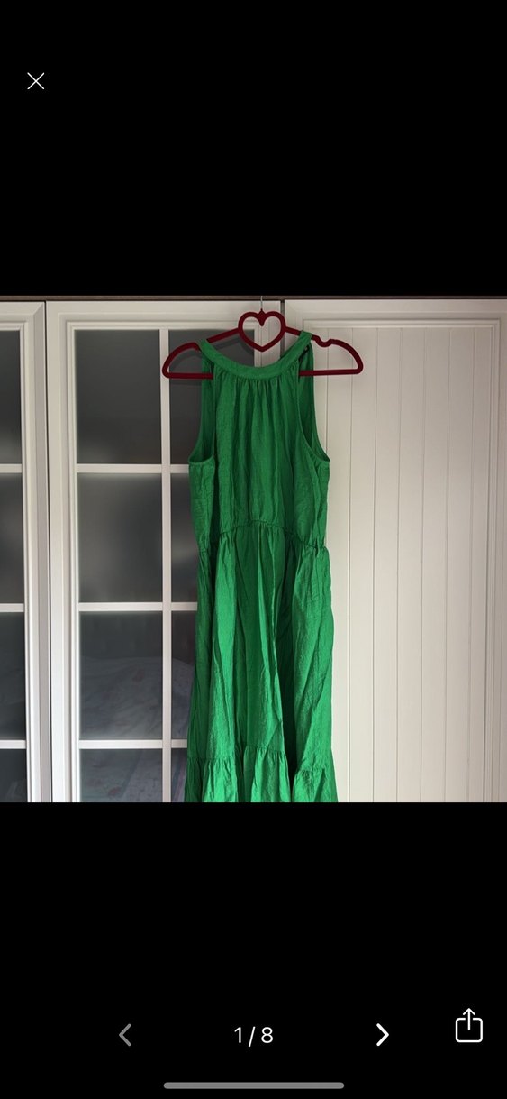 Yüksek yakalı, kolsuz, drapeli yeşil keten elbise. Parlak dokusu ve bohem tarzıyla günlük kullanıma uygundur.